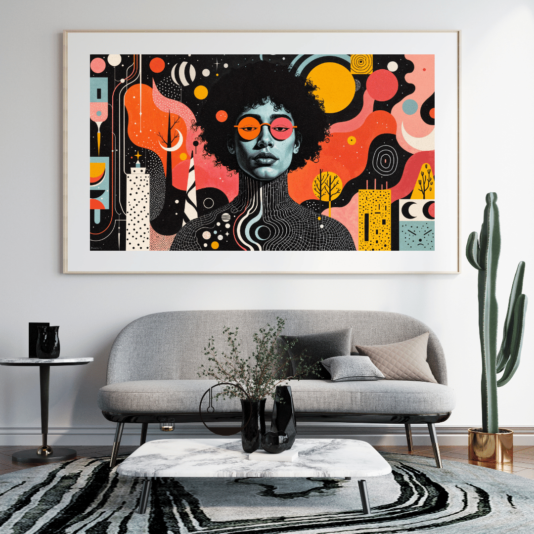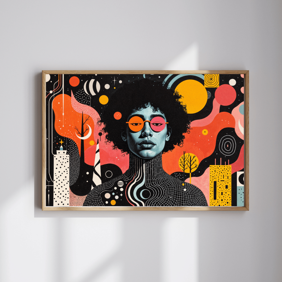 Unlock the mysteries of the universe with "Cosmic Vision", a bold abstract digital artwork that fuses surreal portraiture with a cosmic dreamscape.