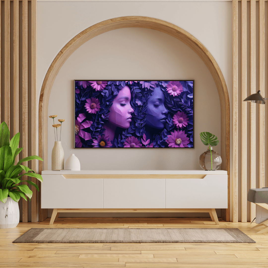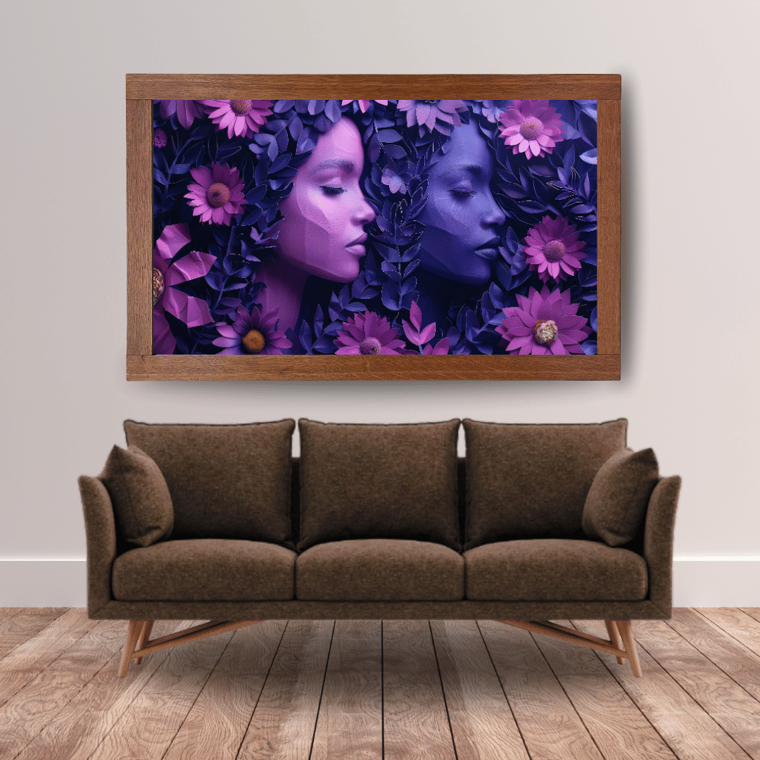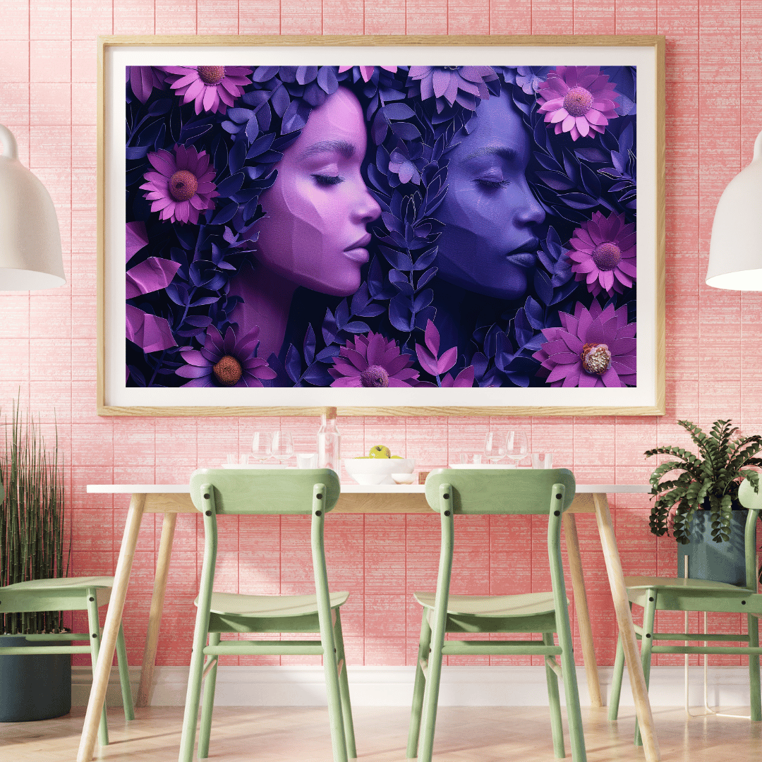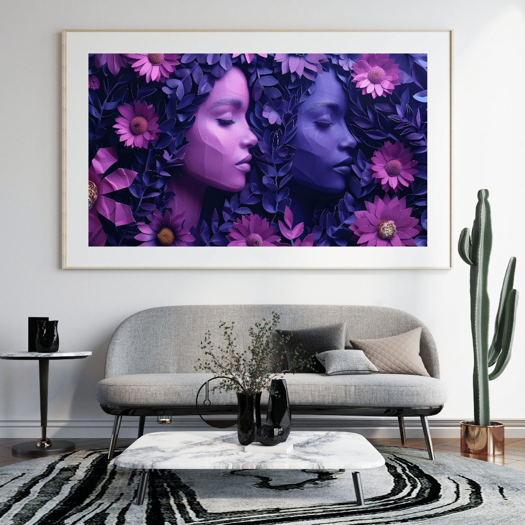 Step into a dreamlike garden of color and calm with "Dual Bloom", a mesmerizing digital artwork that captures two serene feminine profiles enveloped in a lush world of violet petals and soft floral textures.