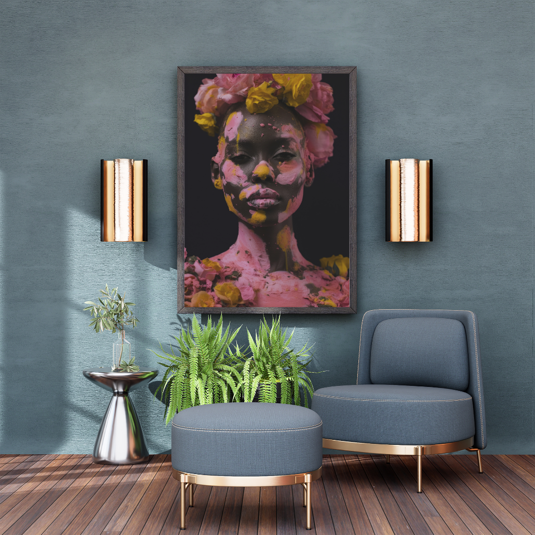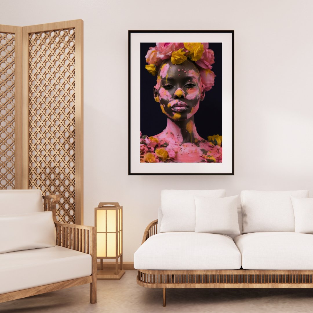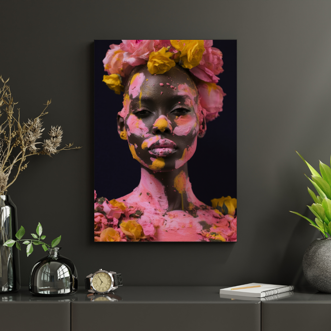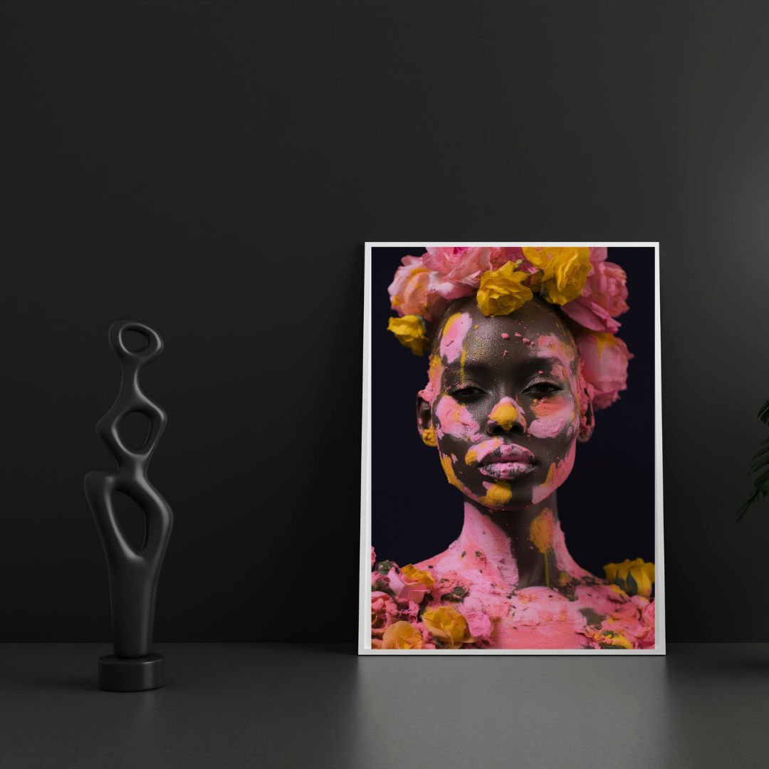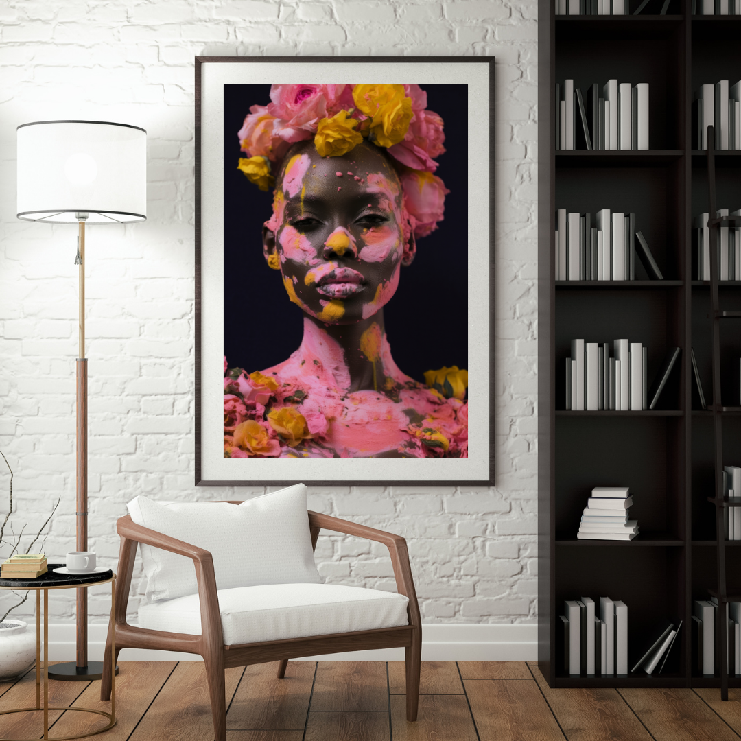 Celebrate bold expression and natural elegance with "Floral Majesty", a striking digital portrait that blends high fashion, fine art, and vibrant symbolism. Featuring a poised woman adorned with pink and yellow flowers, her skin becomes a canvas of color — painted in expressive textures that speak of identity, nature, and strength. This artwork radiates confidence, beauty, and cultural richness.