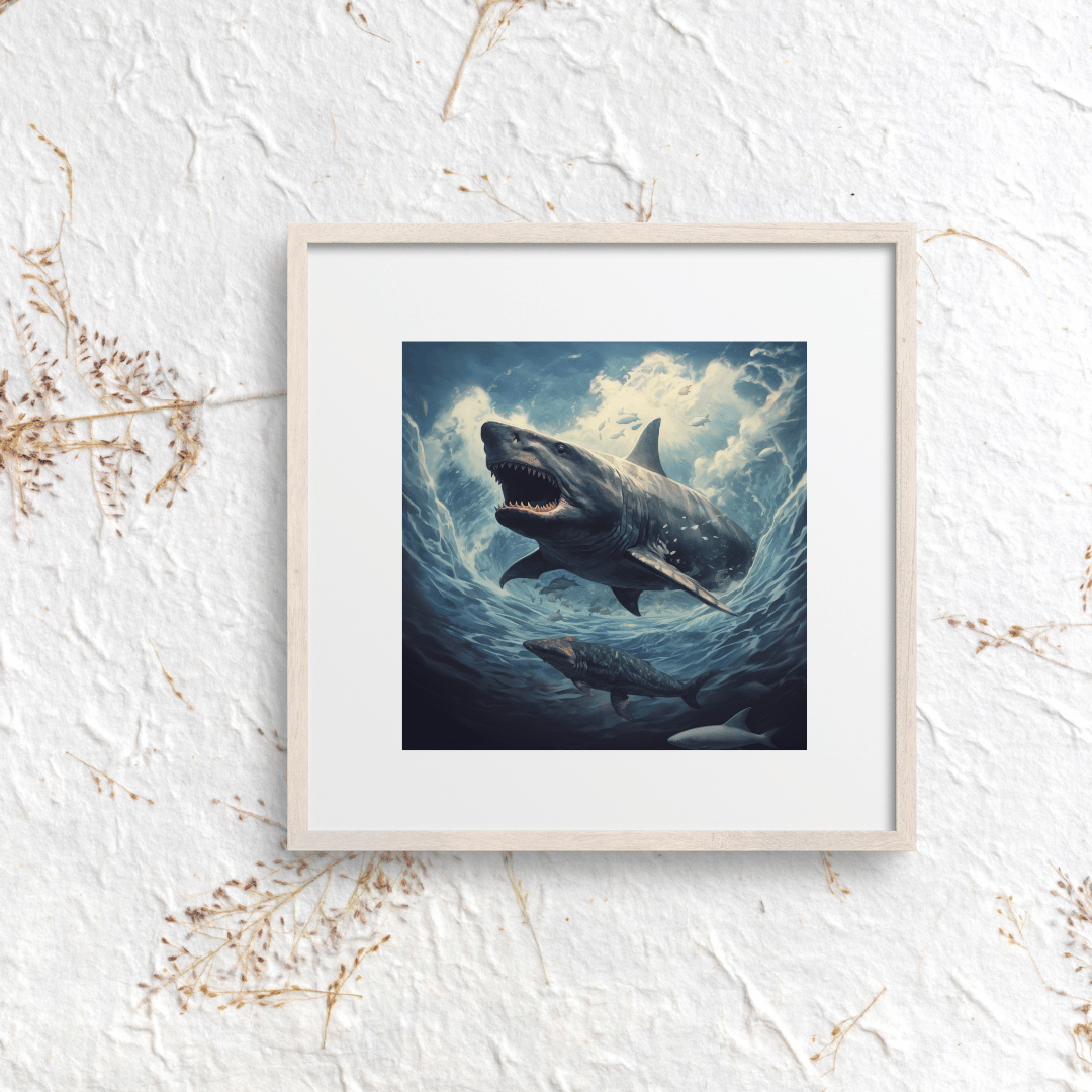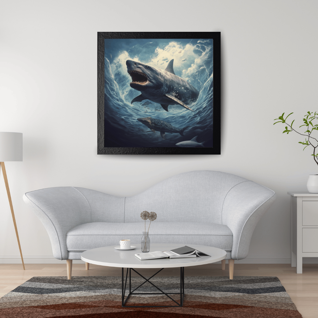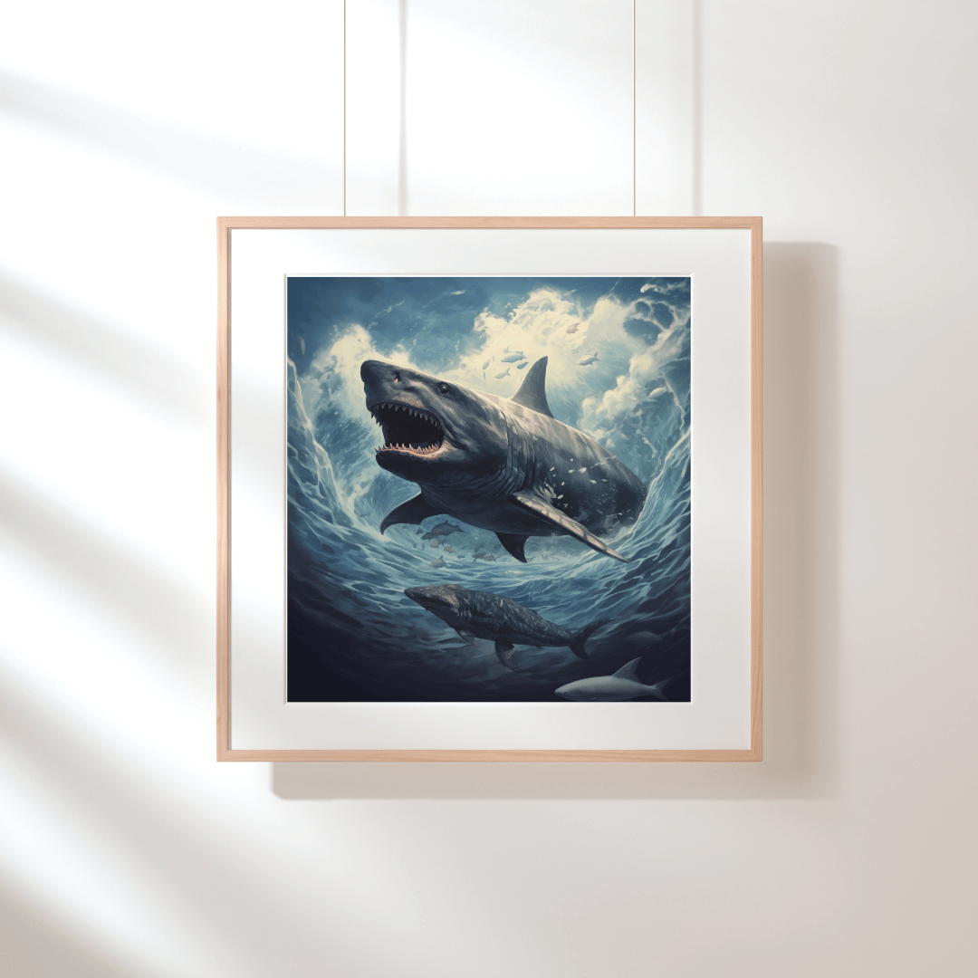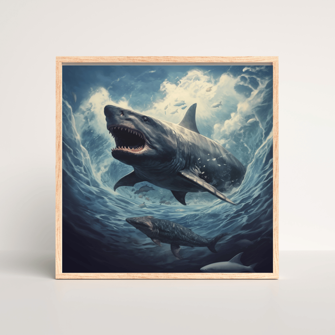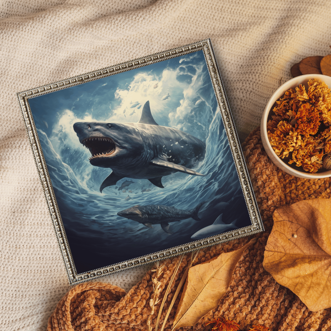 Unleash the raw power of the sea with this breathtaking digital artwork of a giant shark surging through the waves. Capturing the drama of the ocean depths with vivid detail, this piece combines ferocity, motion, and mystery in one striking scene.