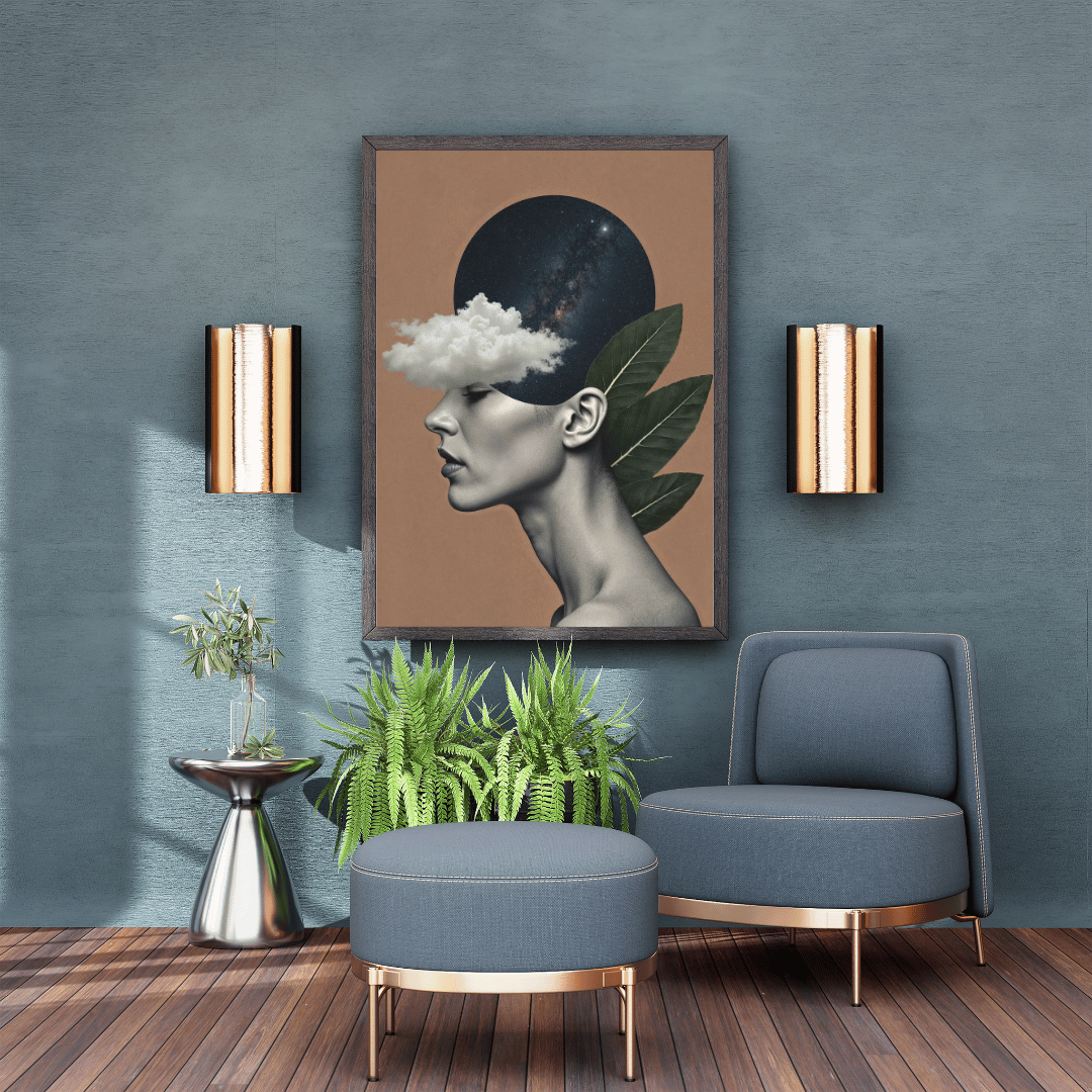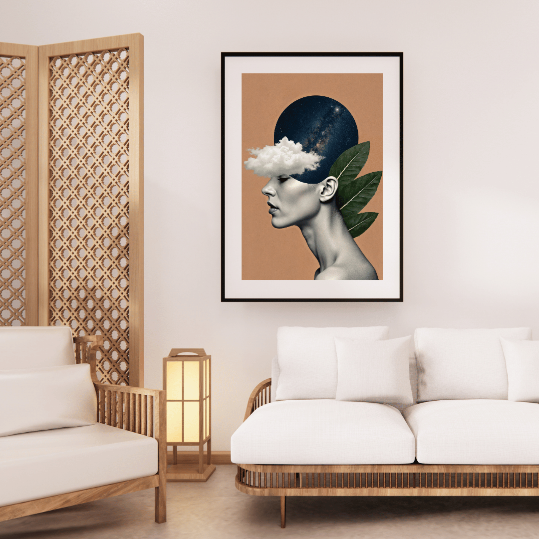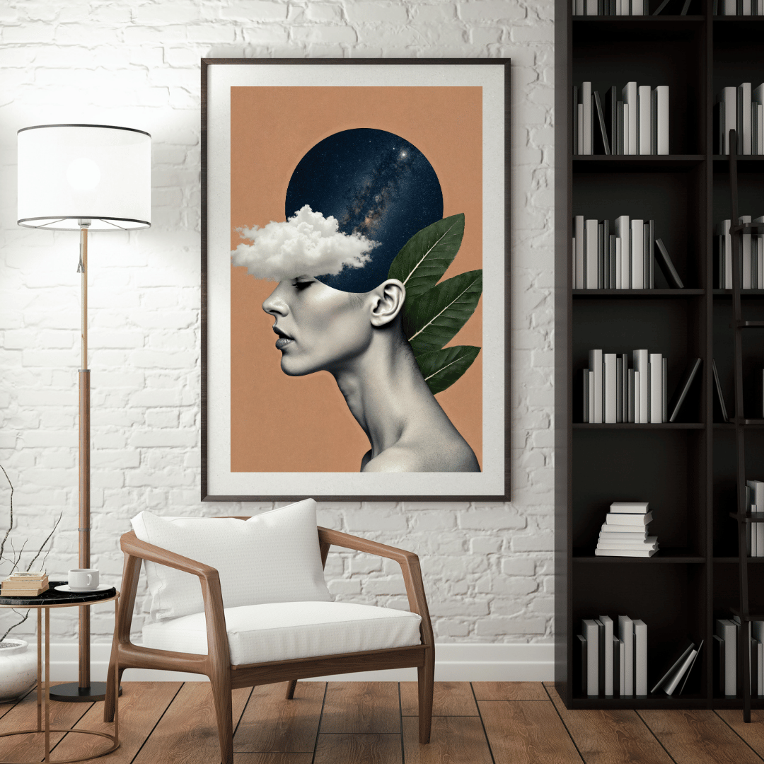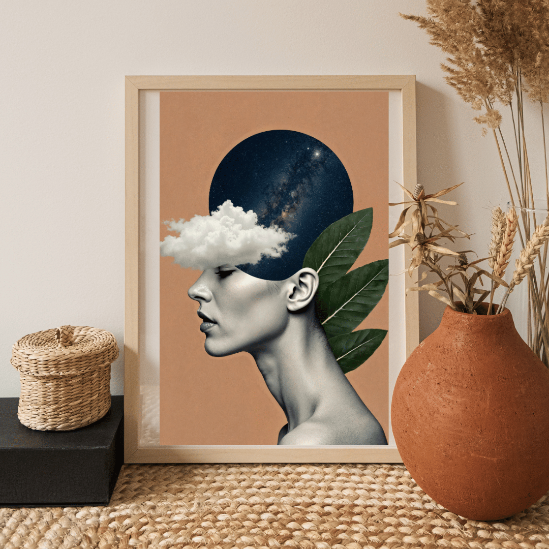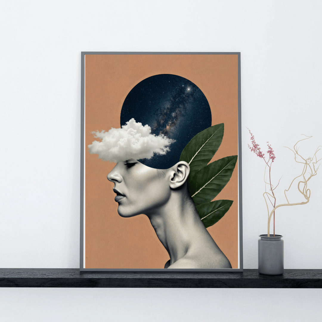Let your imagination drift with "Mindscape", a modern surreal digital collage that fuses the realms of inner thought, nature, and the universe. Featuring a grayscale female profile with a galaxy-filled head, leafy details, and a soft cloud escaping from her mind — this piece symbolizes balance between the natural world and infinite consciousness.