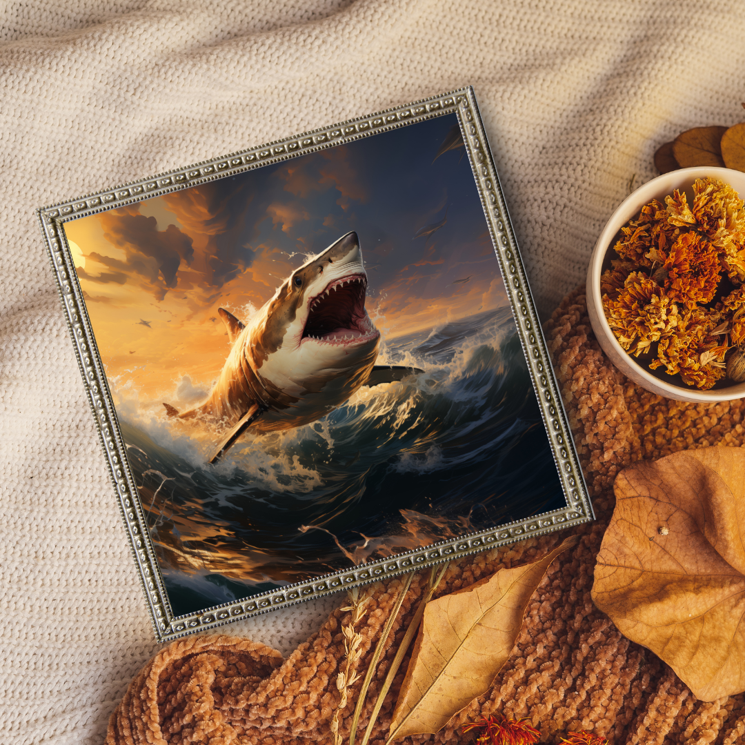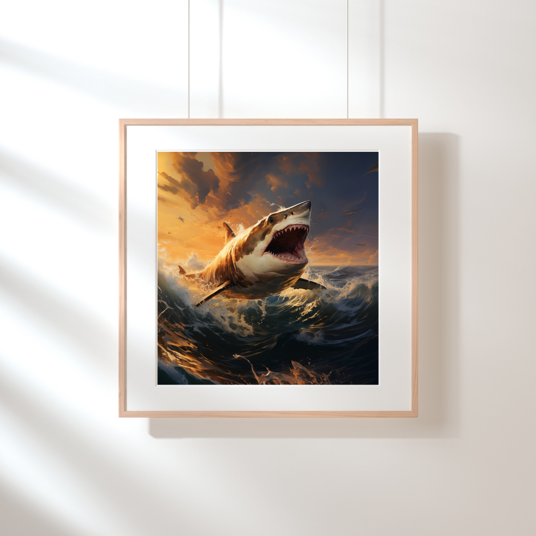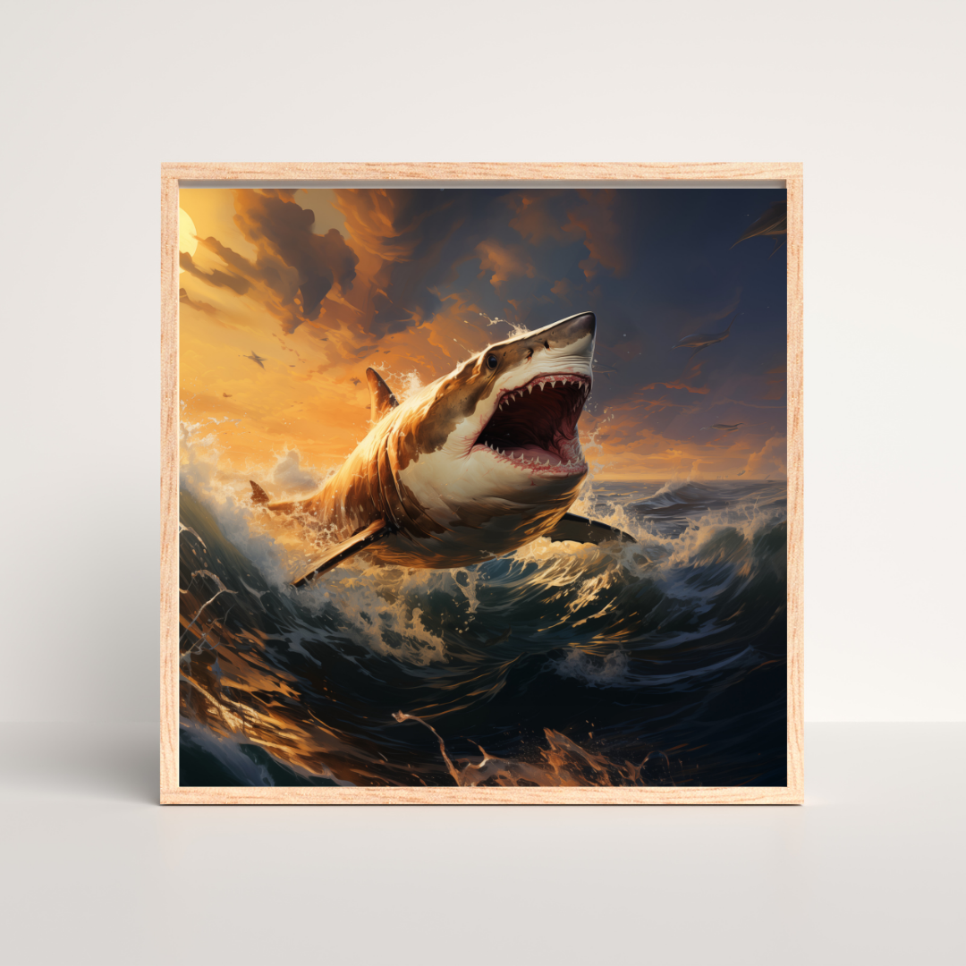 Dive into the heart of the ocean's power with "Fury of the Deep", a captivating digital artwork of a great white shark launching from the waves. With jaws wide open and teeth bared, this powerful predator is caught mid-attack, embodying the raw, untamed energy of the deep sea. The vibrant sunset sky and tumultuous water amplify the shark’s primal force, creating a moment of pure intensity.